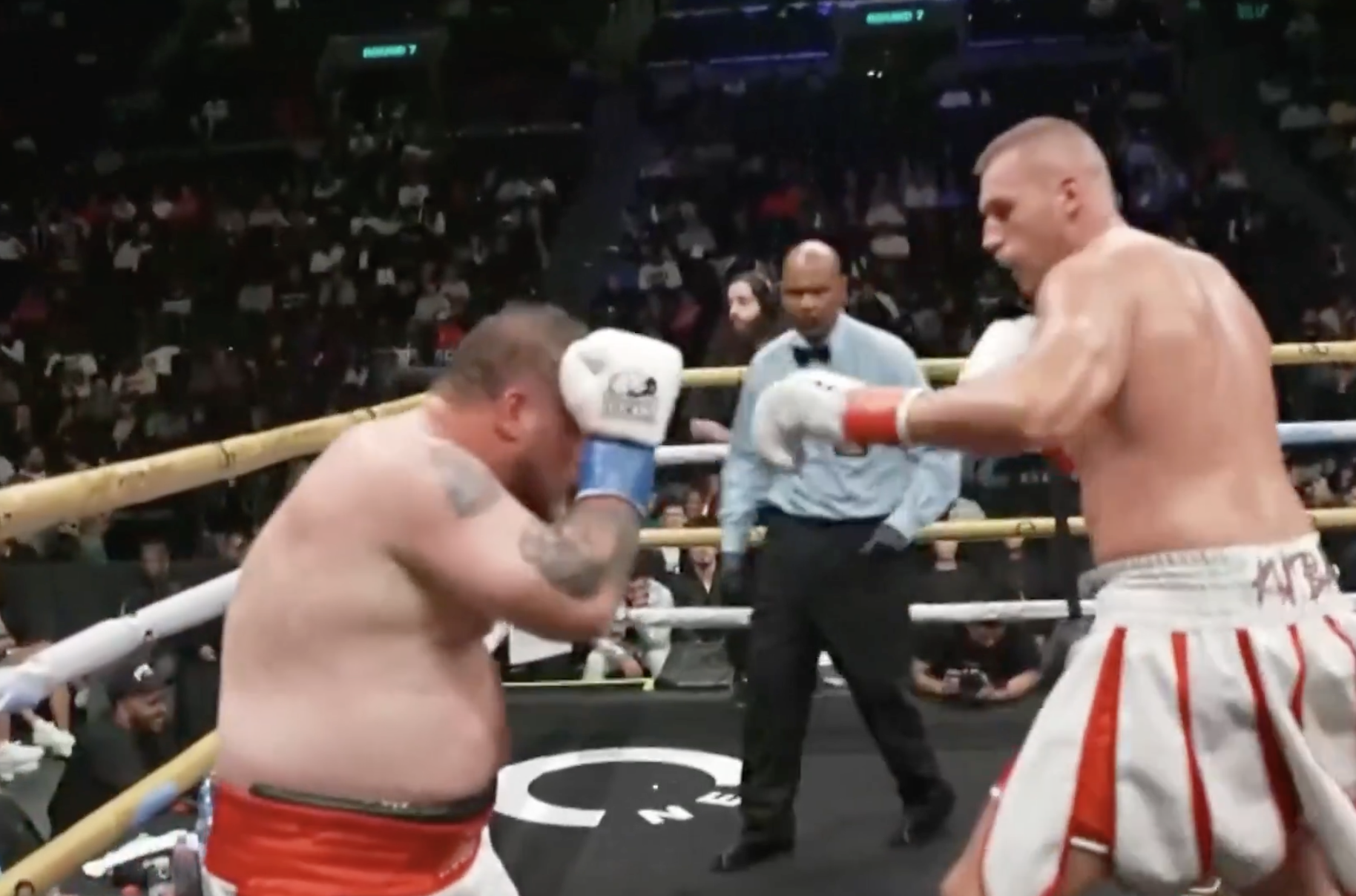 Runda 7: Damian Knyba, atakuje lewym prostym, a potem prawym hakiem na korpus. Joey Dawejko natomiast odpowiada opadającym prawym sierpem. Następnie Polak przyśpiesza i ponownie atakuje potężnymi podbródkowymi w półdystansie. Później Amerykanin wpada w nie lada tarapaty. Knyba rozpuszcza ręce; trafia mocnym hakiem oraz podbródkowym, a potem serią sierpów. Joey Dawejko po tej akcji upada na matę ringu i mamy koniec walki.